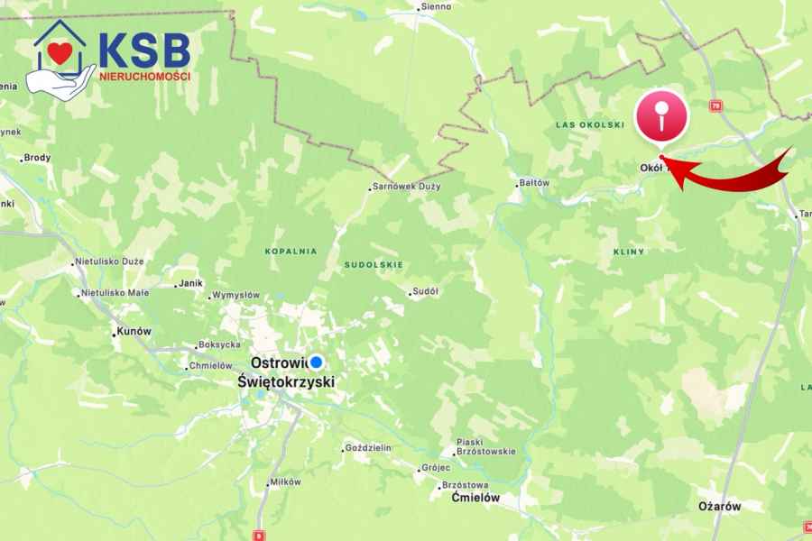 Dom 71,7m2 umiejscowiony na działce o powierzchni 3051m2 w miejscowości Okół. Działka z bezpośrednim dostępem do drogi publicznej, w kształcie nieregularnego prostokąta, z pasem drogi dojazdowej do drogi publicznej. Działka zlokalizowana pośród zielonej okolicy, pól, łąk i lasów, co zapewnia ciszę, spokój i bliski kontakt z naturą. Dom umiejscowiony w głębi działki co pozwala z powodzeniem odizolować się od szumu drogi.