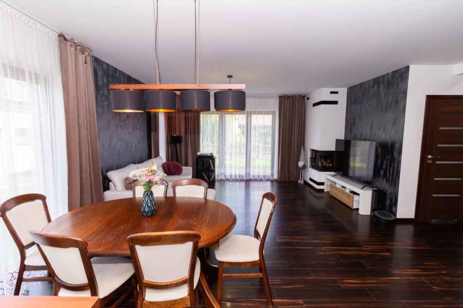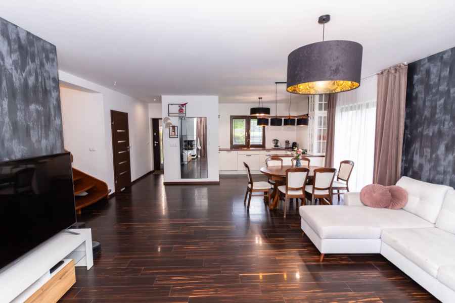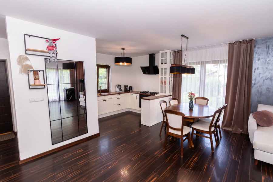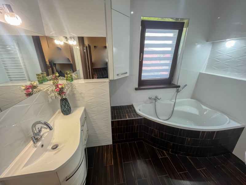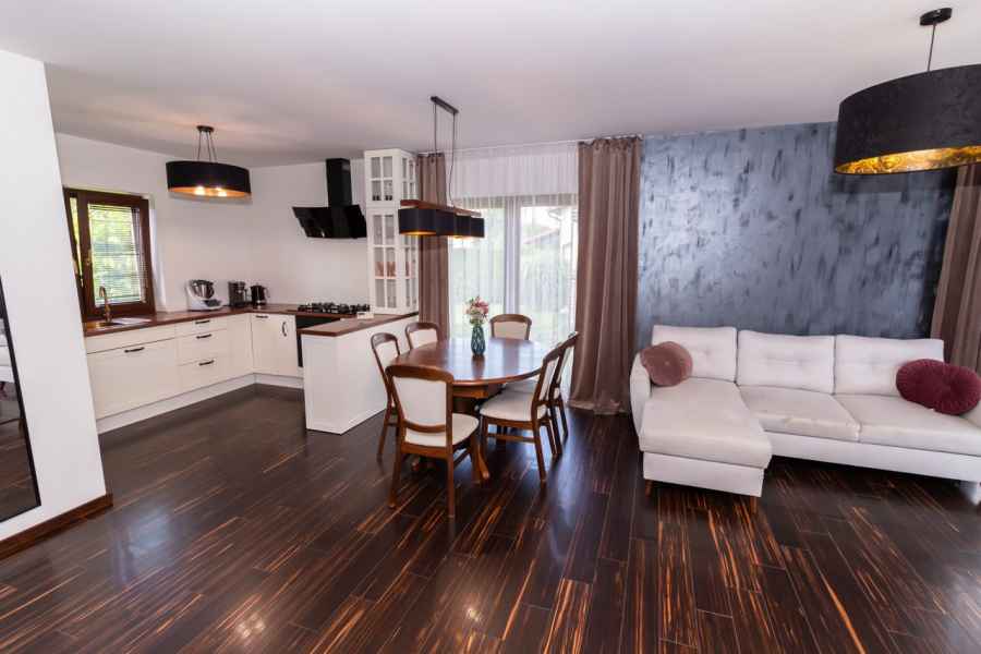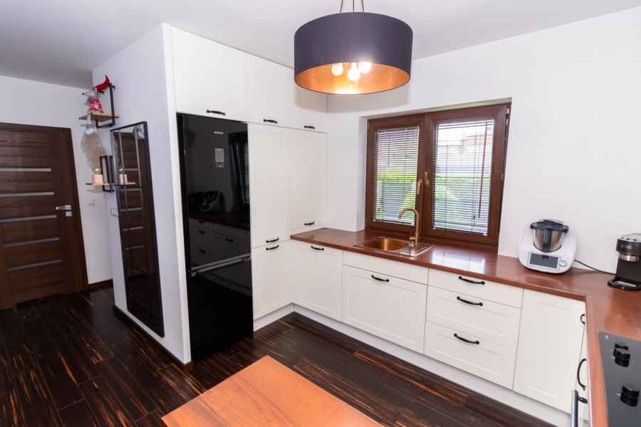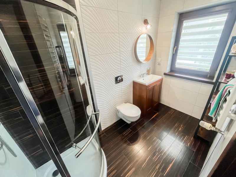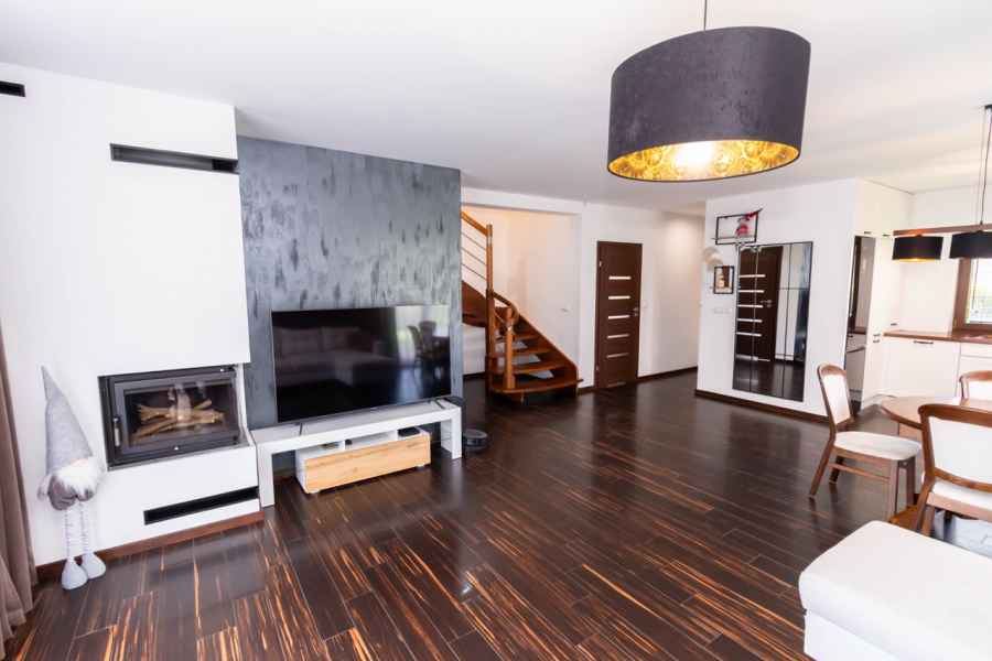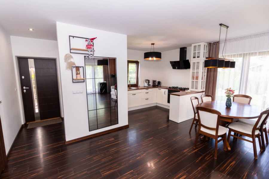Przestronny, widny dom wolnostojący o powierzchni użytkowej111,48m2 usytuowany na działce 542m2 w miejscowości Bodzechów na przedmieściach Ostrowca Świętokrzyskiego. Wybudowany w 2019r. wg projektu Z297 firmy Z500. Jest to projekt o prostej bryle z dachem dwuspadowym oraz piętrem o pełnej wysokości, bez skosów. Właściciele nieco powiększyli oryginalny projekt. Na parterze znajduje się przestronny, widny salon połączonym z jadalnią i kuchnią, łazienka z prysznicem oraz kotłownia/pralnia (z wyjściem na ogród). Salon to 26,7m2 powierzchni z bezpośrednim wyjściem na część ogrodową oraz klimatycznym kominkiem umilającym długie zimowe wieczory. W kuchni zamontowane meble w zabudowie z drewnianymi blatami. Kuchnia wyposażona w lodówkę, zmywarkę, 5-palnikową kuchnię gazową i piekarnik w zabudowie. W przedpokoju znajdują się szafy oraz siedzisko. Piętro to prywatna strefa domowników - łazienka z wanną i 3 sypialnie. Jedna z nich posiada pojemną garderobę oraz wyjście na balkon. Budynek posiada też obszerny strych. Stan murów i konstrukcji dachowej w stanie idealnym. Elewacja położona na części domu. Drzwi wejściowe przeciwwłamaniowe. Okna PVC Winergetic Pramium firmy Oknoplast zapewniające bardzo dobrą izolację termiczną. Na dachu dobrej jakości blachodachówka. Wszystkie instalacje sprawne. Dom ocieplony 15-centymetrową warstwą styropianu Termo Organika Gold, część dachowa ocieplona wełną mineralną Rockwool. Budynek ogrzewany automatycznym piecem gazowym. dwufunkcyjnym z zasobnikiem wody. W całości domu zamontowane zostało ogrzewanie podłogowe. Budynek bardzo ekonomiczny pod względem ogrzewania! Podłogi wyłożone terakotą i panelami. Parapety i wykończenia drewniane. Łazienki wykończone glazurą i terakotą. Balustrady i schody samonośne wykonane z drewna jesionowego. Na ścianach gładzie. Zamontowana również została stacja uzdatniania wody. Działka wyposażona we wszystkie potrzebne media.