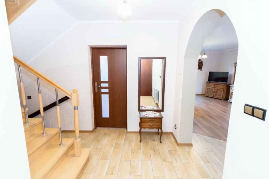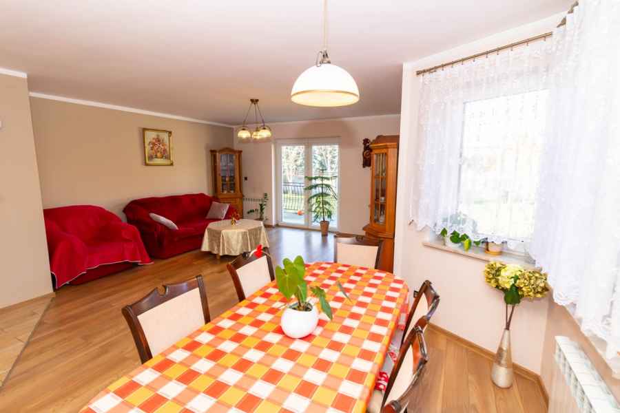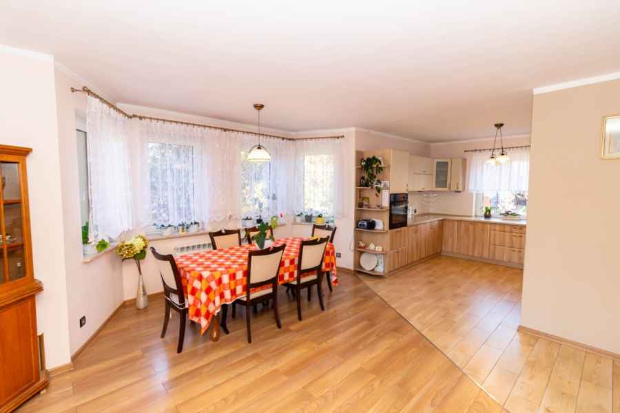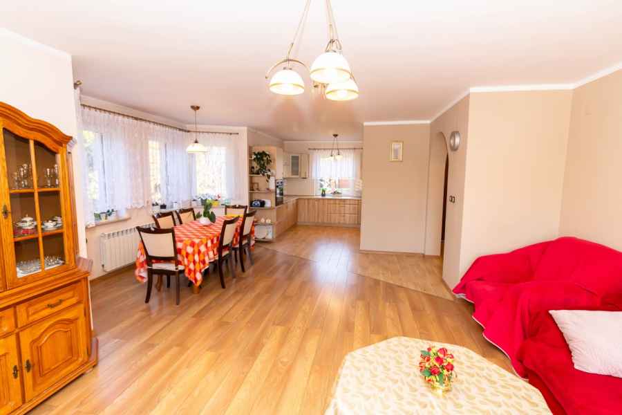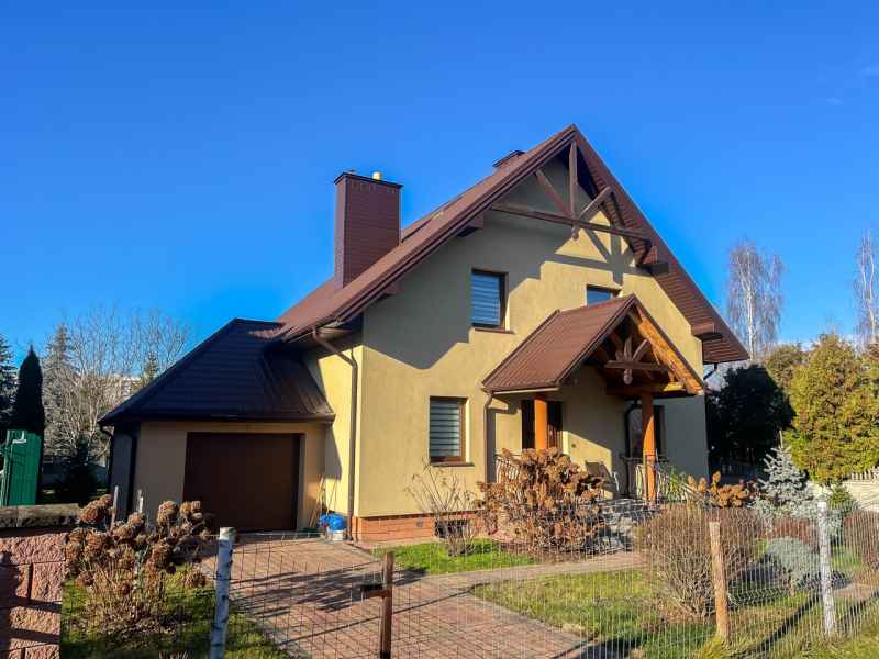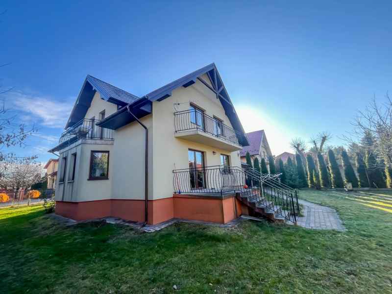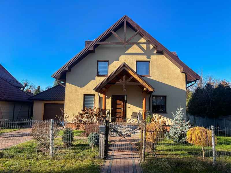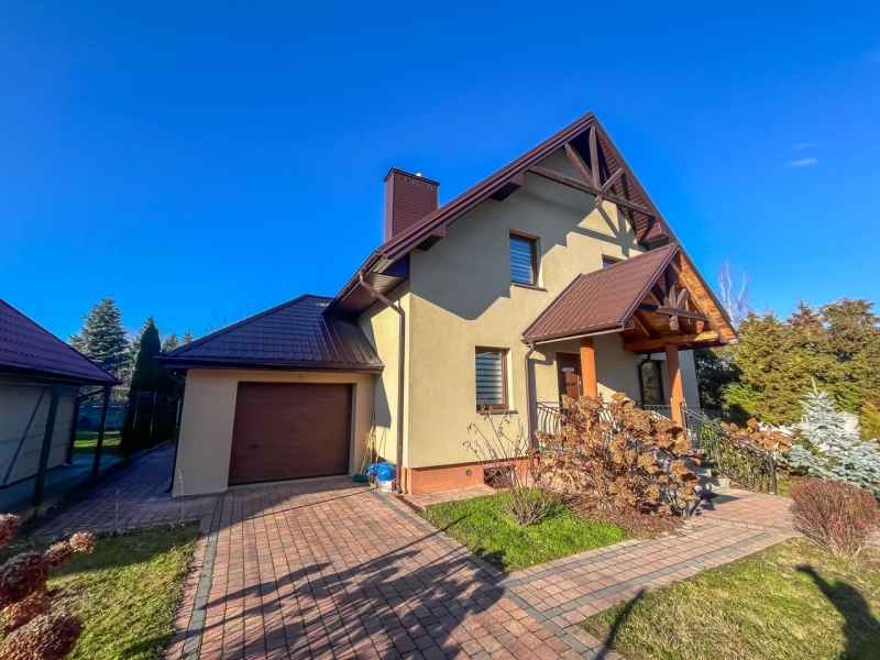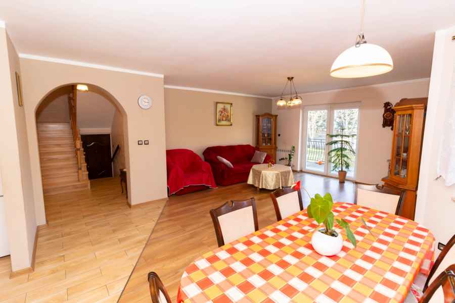 Dom wolnostojący, wybudowany w 2015r., o powierzchni użytkowej 185m2 usytuowany na ogrodzonej działce 878m2. Na parterze znajduje się przestronny, dobrze doświetlony salon połączony z jadalnią i kuchnią, duży pokój, łazienka z prysznicem oraz wiatrołap, w którym znajduje się pojemna szafa. Salon to 34,96m2 powierzchni z bezpośrednim wyjściem na taras i część ogrodową. Kuchnia jest widna, z oknem wychodzącym na frontową cześć działki, wyposażona w meble w zabudowie oraz sprzęt AGD: zmywarkę, płytę indukcyjną i piekarnik. W części parterowej znajduje się bezpośrednie wejście do garażu (brama garażowa segmentowa, otwierana do góry) oraz przyziemia, w którym znajduje się kotłownia, toaleta oraz pomieszczenie gospodarcze, które można przeznaczyć na spiżarnię, schowek, warsztat lub domową siłownię. Na piętro prowadzą murowane schody obudowane drewnem. Piętro to prywatna strefa domowników, obejmująca łazienkę z wanną, 3 duże sypialnie i garderobę z wejściem na obszerny strych. Każda z sypialni posiada duży balkon.