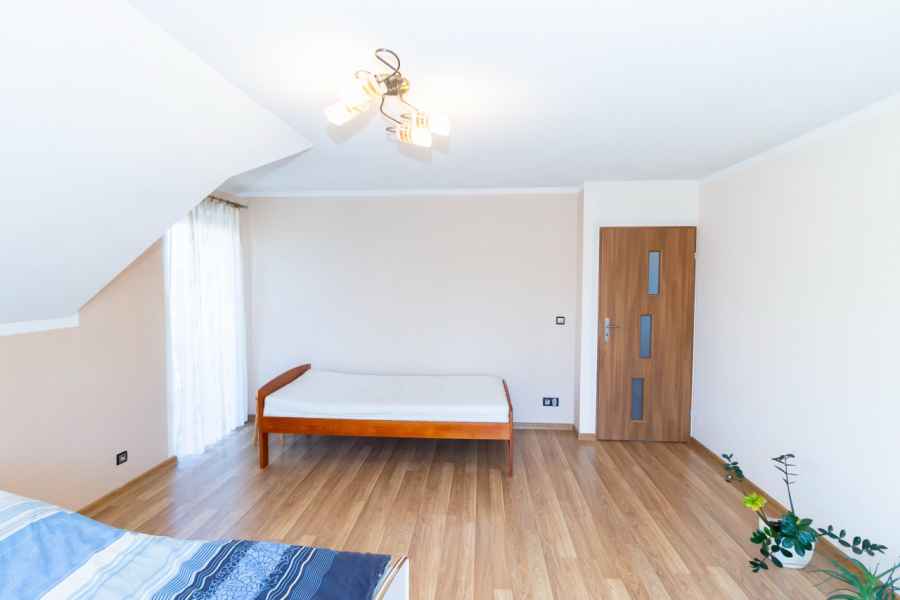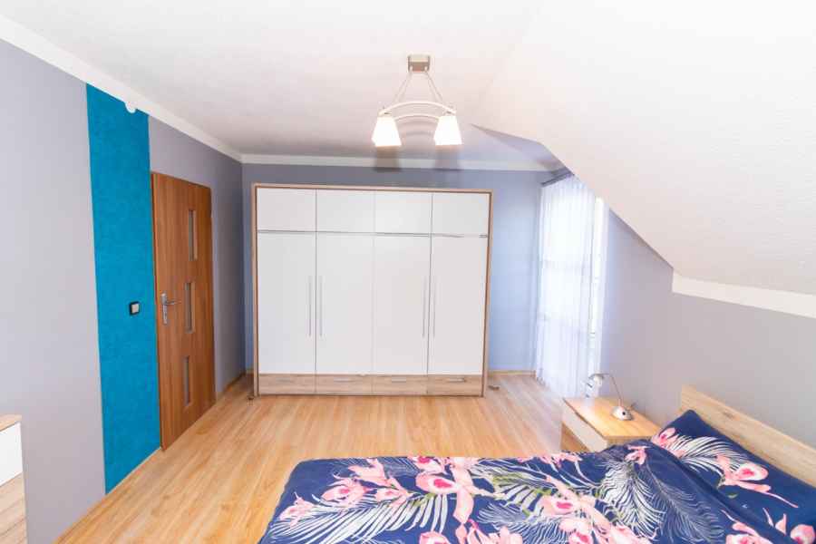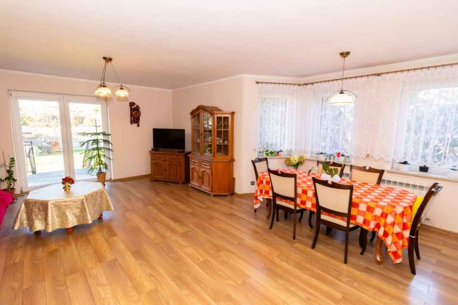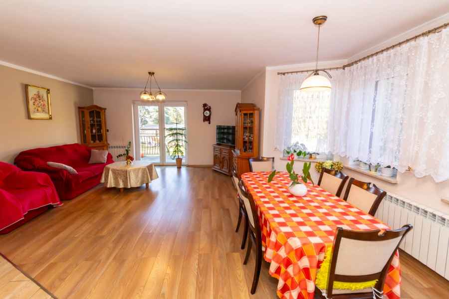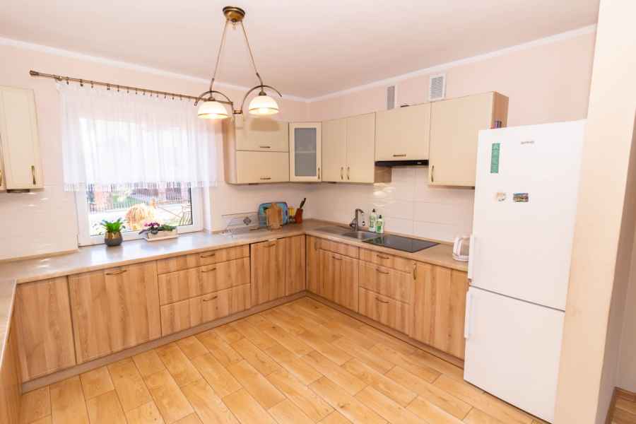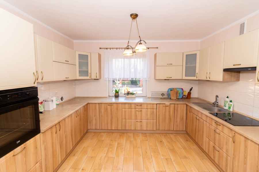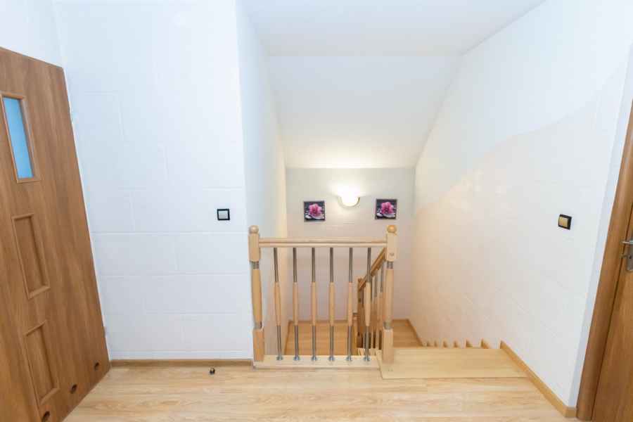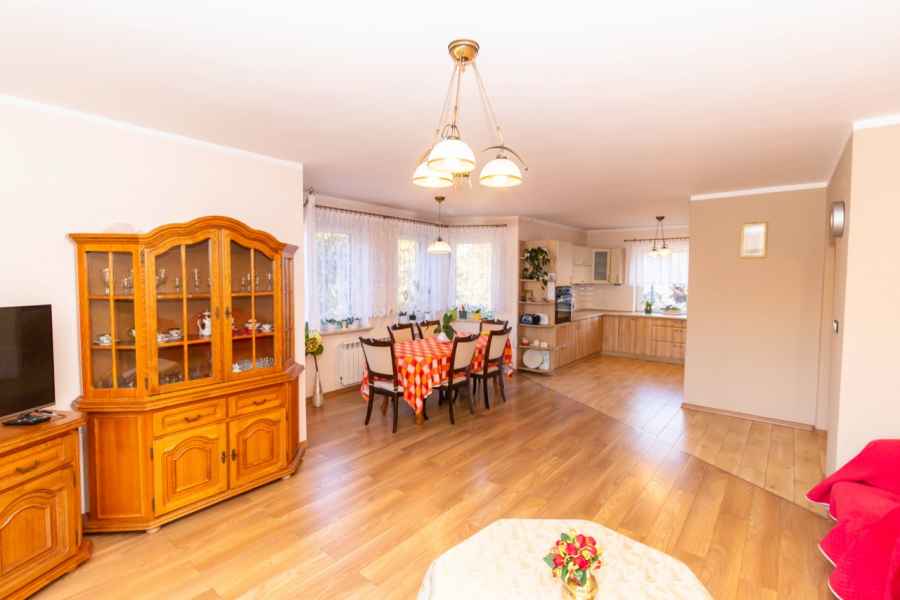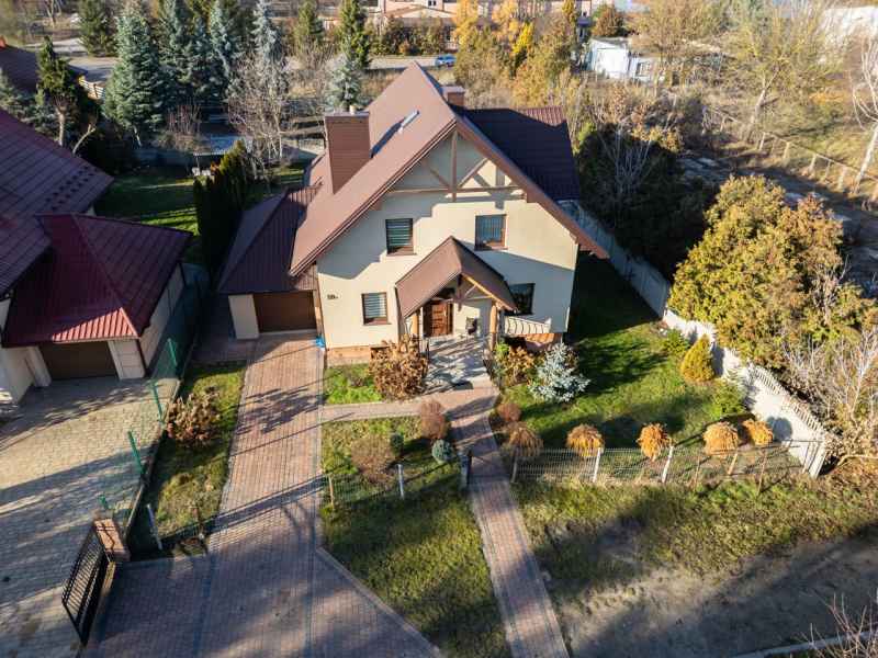 Dom wolnostojący, wybudowany w 2015r., o powierzchni użytkowej 185m2 usytuowany na ogrodzonej działce 878m2. Na parterze znajduje się przestronny, dobrze doświetlony salon połączony z jadalnią i kuchnią, duży pokój, łazienka z prysznicem oraz wiatrołap, w którym znajduje się pojemna szafa. Salon to 34,96m2 powierzchni z bezpośrednim wyjściem na taras i część ogrodową. Kuchnia jest widna, z oknem wychodzącym na frontową cześć działki, wyposażona w meble w zabudowie oraz sprzęt AGD: zmywarkę, płytę indukcyjną i piekarnik. W części parterowej znajduje się bezpośrednie wejście do garażu (brama garażowa segmentowa, otwierana do góry) oraz przyziemia, w którym znajduje się kotłownia, toaleta oraz pomieszczenie gospodarcze, które można przeznaczyć na spiżarnię, schowek, warsztat lub domową siłownię. Na piętro prowadzą murowane schody obudowane drewnem. Piętro to prywatna strefa domowników, obejmująca łazienkę z wanną, 3 duże sypialnie i garderobę z wejściem na obszerny strych. Każda z sypialni posiada duży balkon.