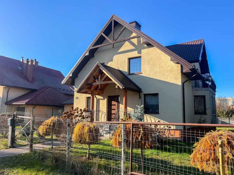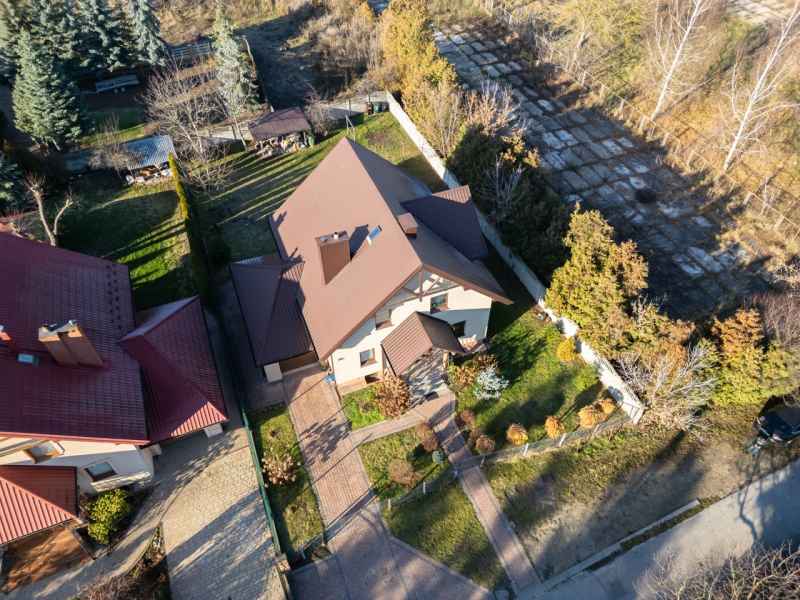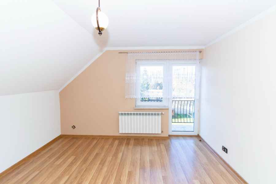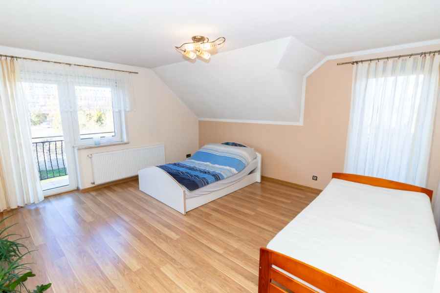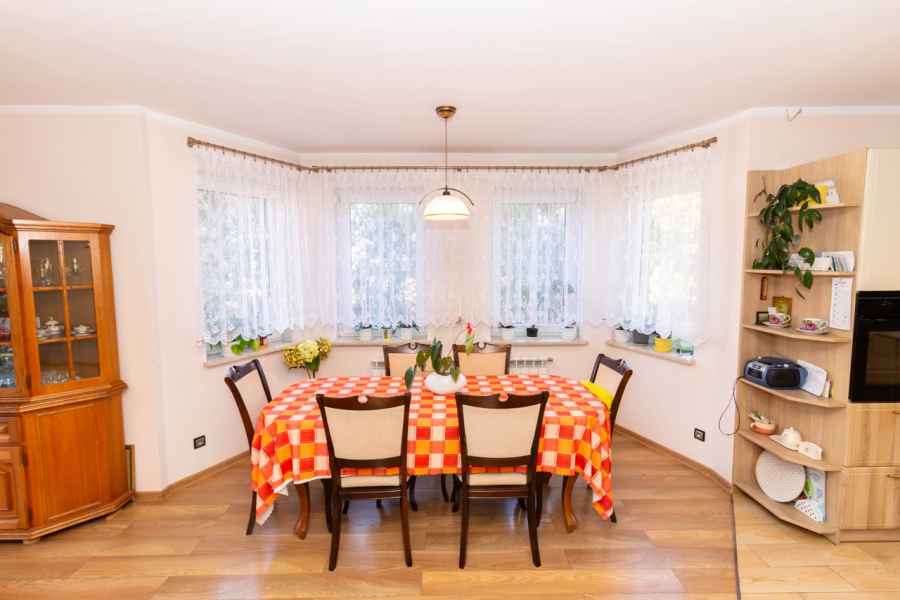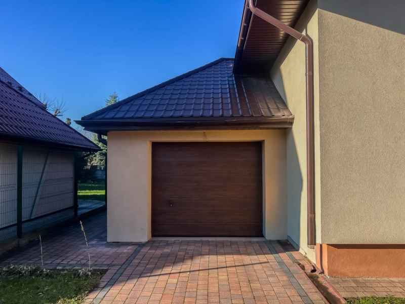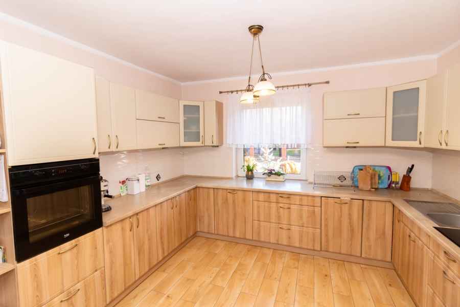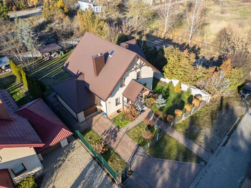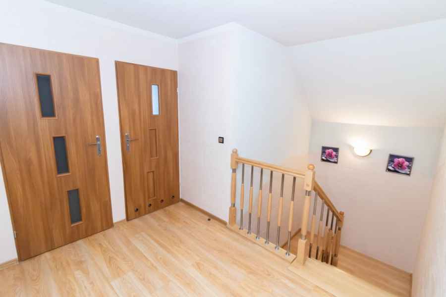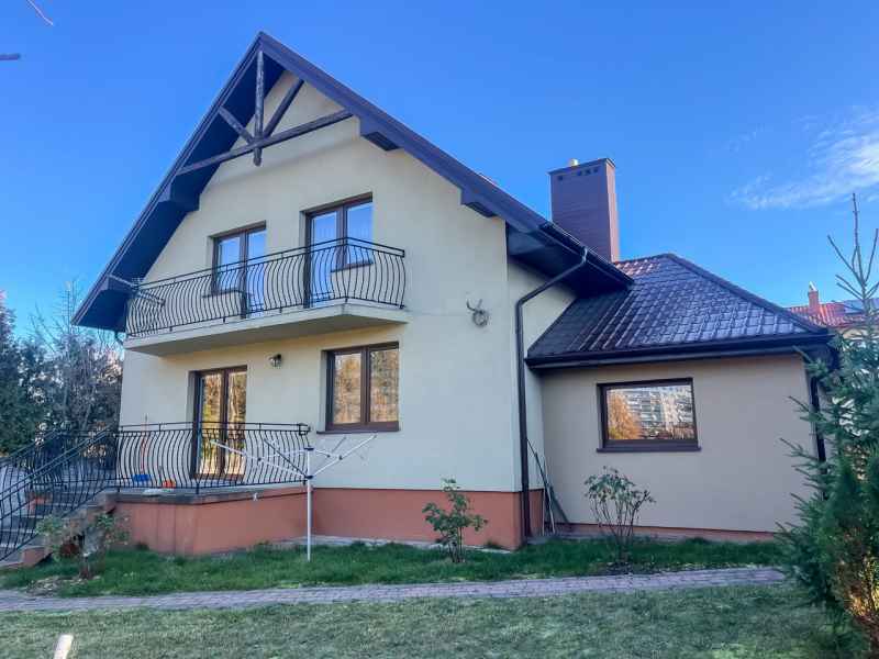 Dom wolnostojący, wybudowany w 2015r., o powierzchni użytkowej 185m2 usytuowany na ogrodzonej działce 878m2. Na parterze znajduje się przestronny, dobrze doświetlony salon połączony z jadalnią i kuchnią, duży pokój, łazienka z prysznicem oraz wiatrołap, w którym znajduje się pojemna szafa. Salon to 34,96m2 powierzchni z bezpośrednim wyjściem na taras i część ogrodową. Kuchnia jest widna, z oknem wychodzącym na frontową cześć działki, wyposażona w meble w zabudowie oraz sprzęt AGD: zmywarkę, płytę indukcyjną i piekarnik. W części parterowej znajduje się bezpośrednie wejście do garażu (brama garażowa segmentowa, otwierana do góry) oraz przyziemia, w którym znajduje się kotłownia, toaleta oraz pomieszczenie gospodarcze, które można przeznaczyć na spiżarnię, schowek, warsztat lub domową siłownię. Na piętro prowadzą murowane schody obudowane drewnem. Piętro to prywatna strefa domowników, obejmująca łazienkę z wanną, 3 duże sypialnie i garderobę z wejściem na obszerny strych. Każda z sypialni posiada duży balkon.