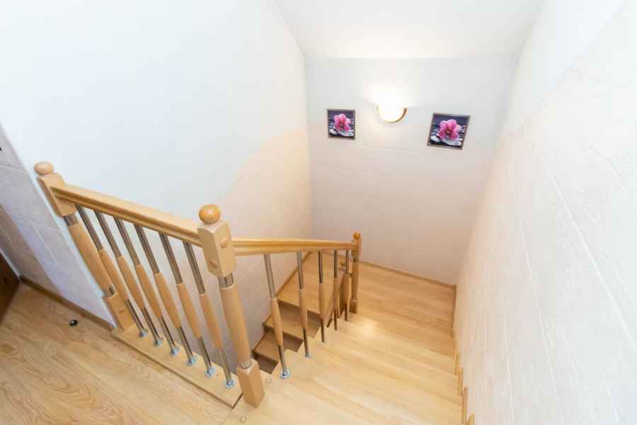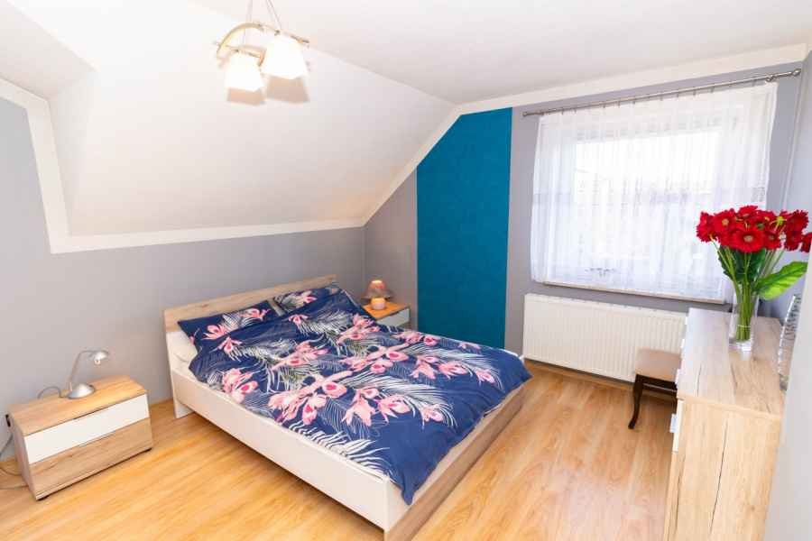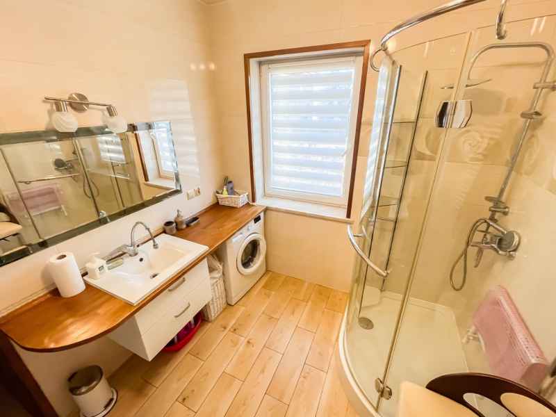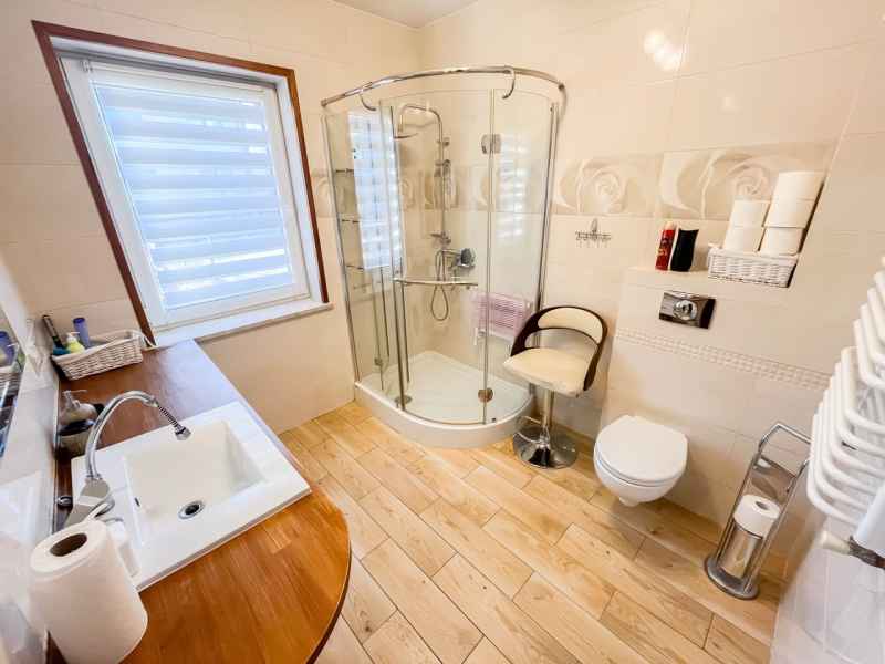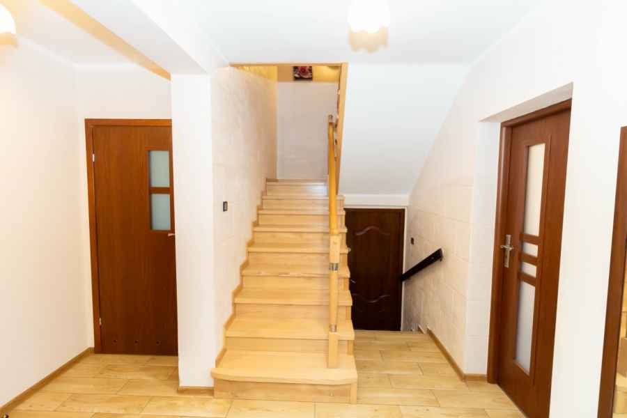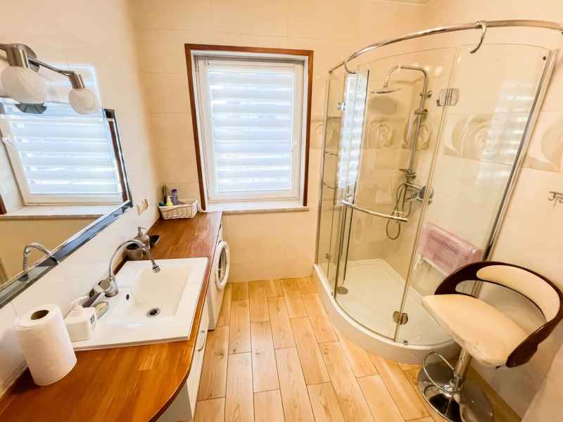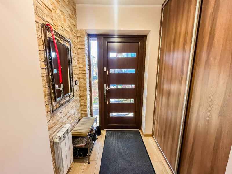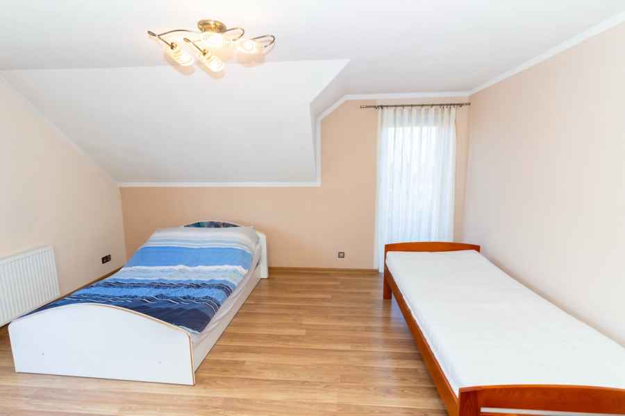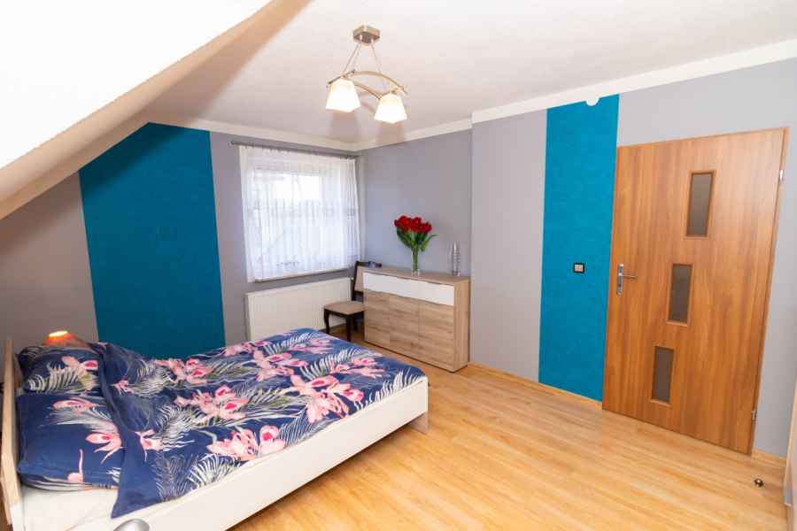 Dom wolnostojący, wybudowany w 2015r., o powierzchni użytkowej 185m2 usytuowany na ogrodzonej działce 878m2. Na parterze znajduje się przestronny, dobrze doświetlony salon połączony z jadalnią i kuchnią, duży pokój, łazienka z prysznicem oraz wiatrołap, w którym znajduje się pojemna szafa. Salon to 34,96m2 powierzchni z bezpośrednim wyjściem na taras i część ogrodową. Kuchnia jest widna, z oknem wychodzącym na frontową cześć działki, wyposażona w meble w zabudowie oraz sprzęt AGD: zmywarkę, płytę indukcyjną i piekarnik. W części parterowej znajduje się bezpośrednie wejście do garażu (brama garażowa segmentowa, otwierana do góry) oraz przyziemia, w którym znajduje się kotłownia, toaleta oraz pomieszczenie gospodarcze, które można przeznaczyć na spiżarnię, schowek, warsztat lub domową siłownię. Na piętro prowadzą murowane schody obudowane drewnem. Piętro to prywatna strefa domowników, obejmująca łazienkę z wanną, 3 duże sypialnie i garderobę z wejściem na obszerny strych. Każda z sypialni posiada duży balkon.