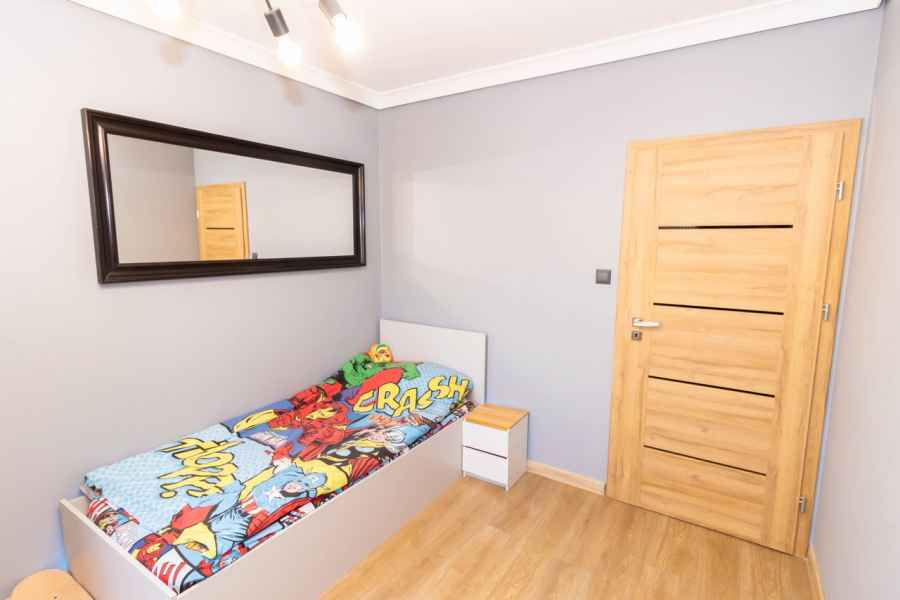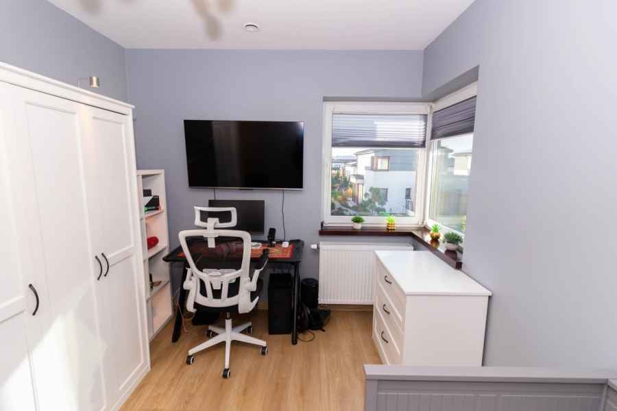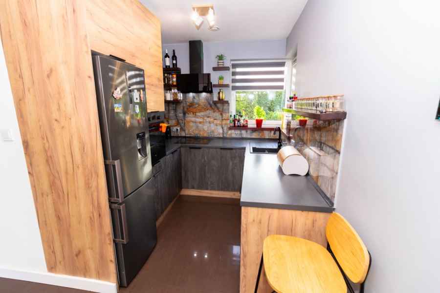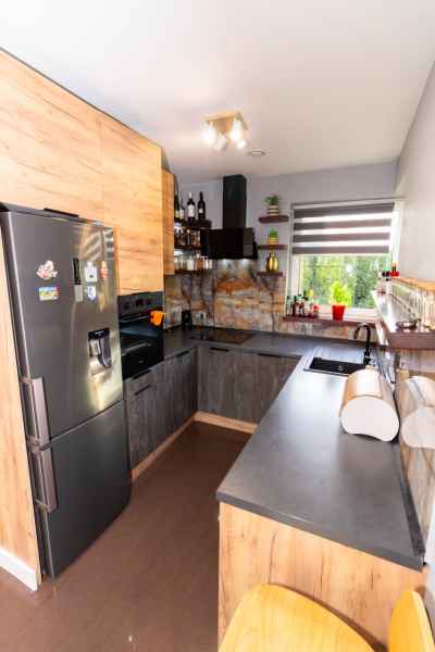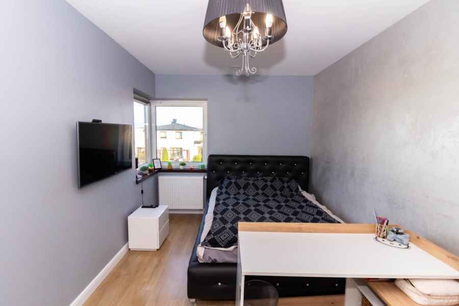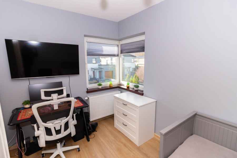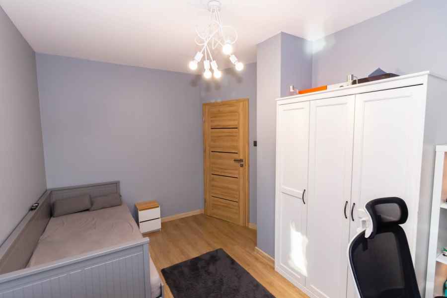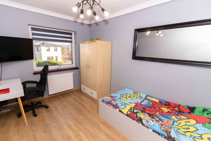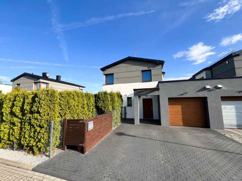Dom w zabudowie bliźniaczej (połączony garażem), wybudowany w 2014r., o powierzchni użytkowej 103,5m2 usytuowany na ogrodzonej działce 563m2. Posesja umiejscowiona na Osiedlu Sielanka, które jest bardzo pożądane przez Klientów poszukujących swojego nowego lokum. Na parterze znajduje się przestronny, dobrze doświetlony przez liczne, wysokie okna salon połączony z jadalnią i kuchnią, toaleta, spiżarnia oraz korytarz, w którym znajduje się pojemna szafa. Salon to 35m2 powierzchni z bezpośrednim wyjściem na taras i część ogrodową. Kuchnia jest widna, z oknem wychodzącym na frontową cześć działki, wyposażona w meble w zabudowie oraz sprzęt AGD: zmywarkę, płytę indukcyjną i piekarnik. W części parterowej znajduje się bezpośrednie wejście do garażu (brama garażowa sterowana zdalnie z aplikacji w telefonie, otwierana do góry). Na piętro prowadzą murowane schody obudowane drewnem i podświetlone. Piętro to prywatna strefa domowników, obejmująca łazienkę z wanną i kabiną prysznicową i 3 duże, widne sypialnie.
