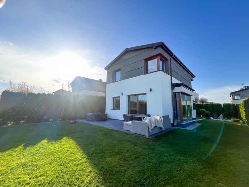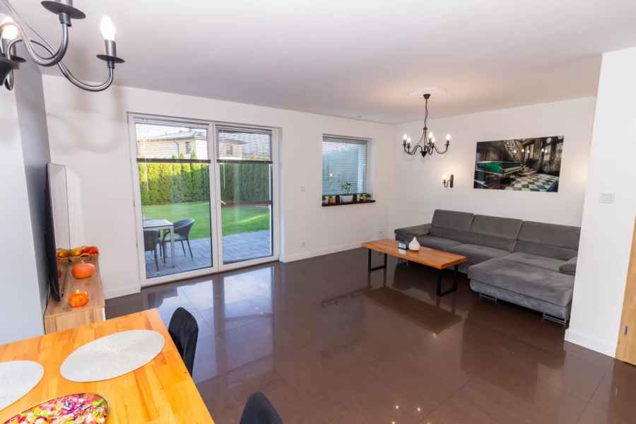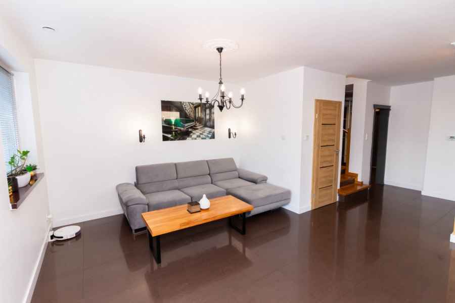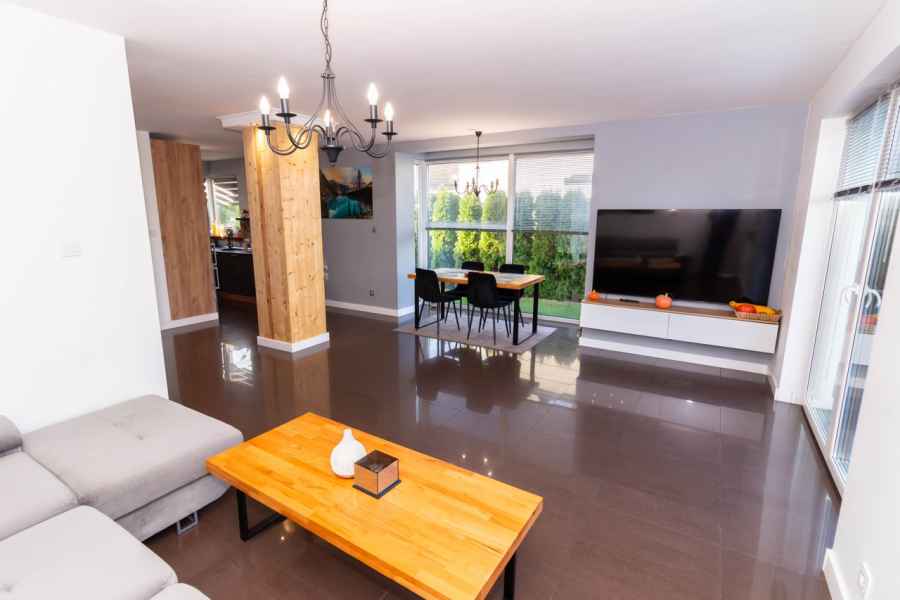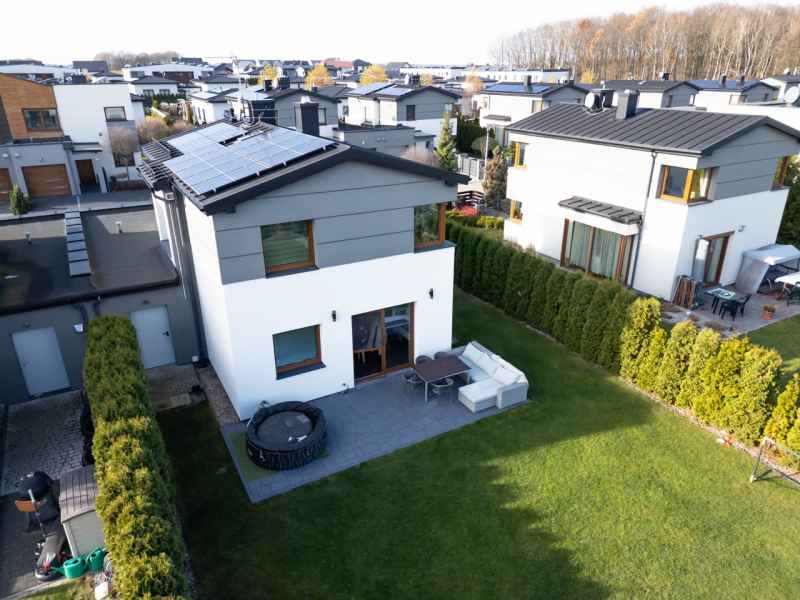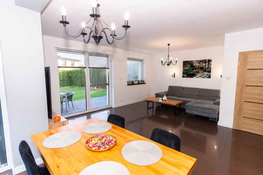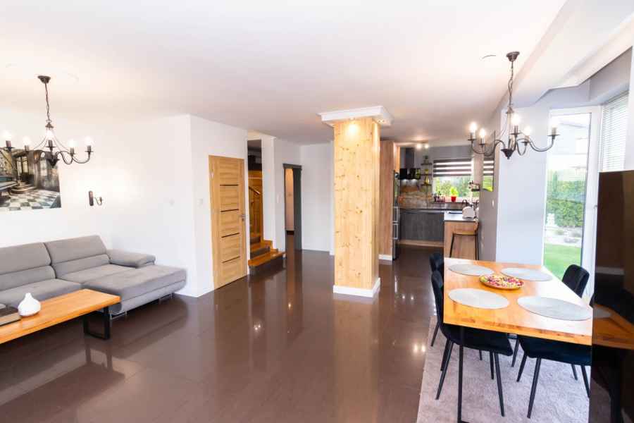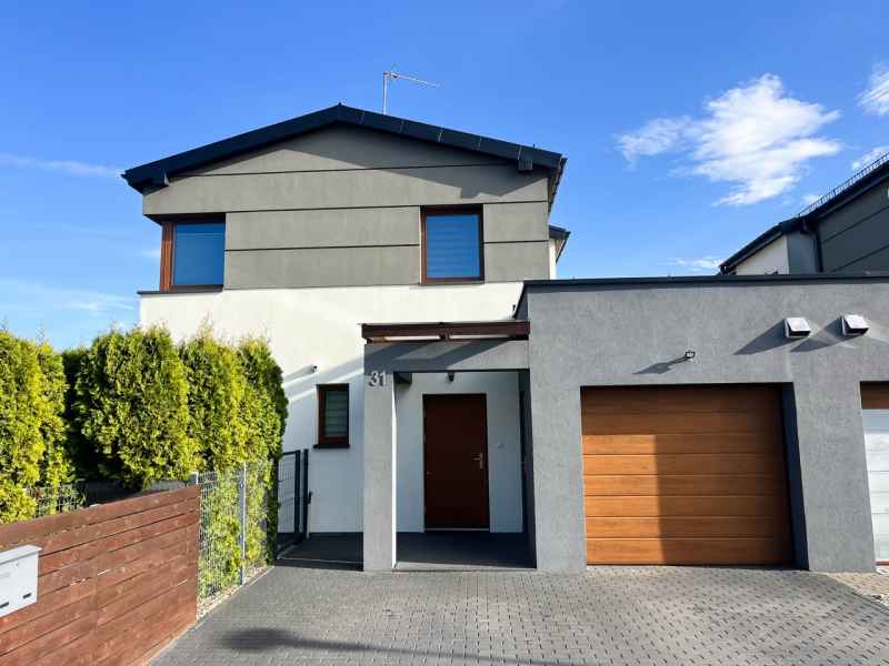 Zarówno mury, jak i konstrukcja dachu są w stanie idealnym. Dom jest ocieplony styropianem i wykończony elewacją. Dom wyposażony jest w wydajną instalację fotowoltaiczną oraz rekuperację co mocno wpływa na niskie koszty energii elektrycznej i gazu. Drzwi wejściowe oraz drzwi prowadzące do garażu - przeciwwłamaniowe. Zamontowano trzyszybowe okna PVC, zapewniające bardzo dobrą izolację termiczną. Ogrzewanie z dwufunkcyjnego pieca gazowego. W części parterowej domu zamontowane zostało ogrzewanie podłogowe na całej powierzchni. Ściany pokryte gładzią. Podłogi wyłożone terakotą i dobrej jakości panelami. Łazienki wykończone glazurą i terakotą. Dach pokryty jest dobrej jakości blachą. Na zewnątrz została zamontowana kamera monitoringowa z czujnikiem ruchu i systemem powiadamiania w przypadku zarejestrowania ruchu. Wszystkie instalacje sprawne. Na tyłach domu mieści się strefa zielona z zadbanym, regularnie pielęgnowanym trawnikiem, nasadzeniami wokół ogrodzenia dającymi intymność oraz tarasem. Na wyposażeniu domu jest automatyczny robot koszący oraz instalacja nawadniająca trawnik - sterowane z poziomu telefonu. Miejsce idealne do wypoczynku czy spotkań rodzinnych.