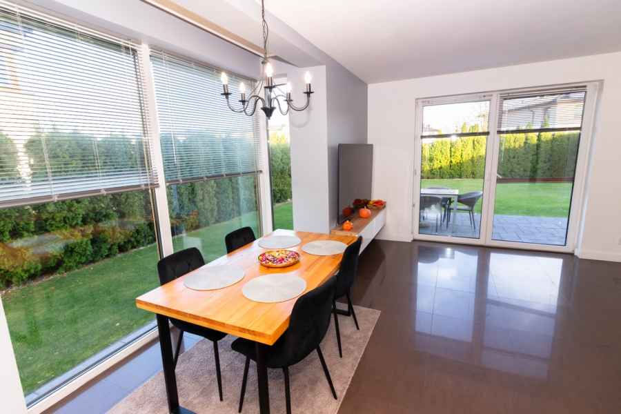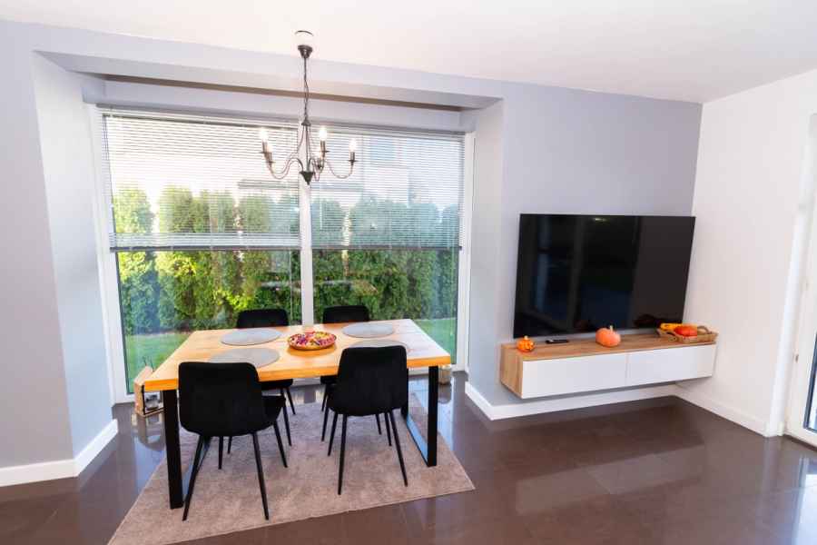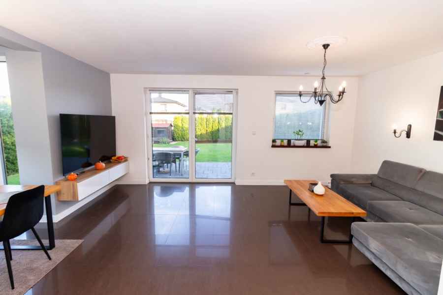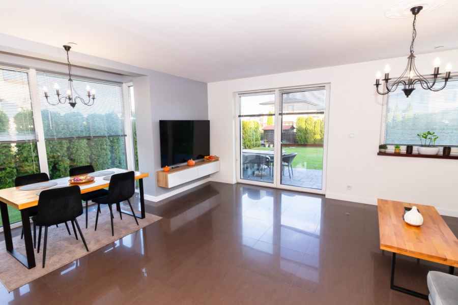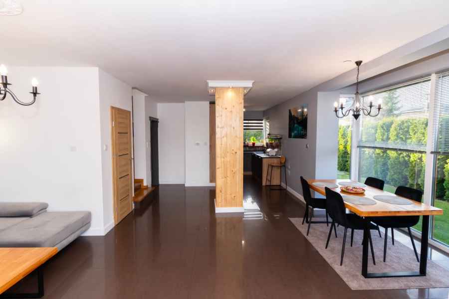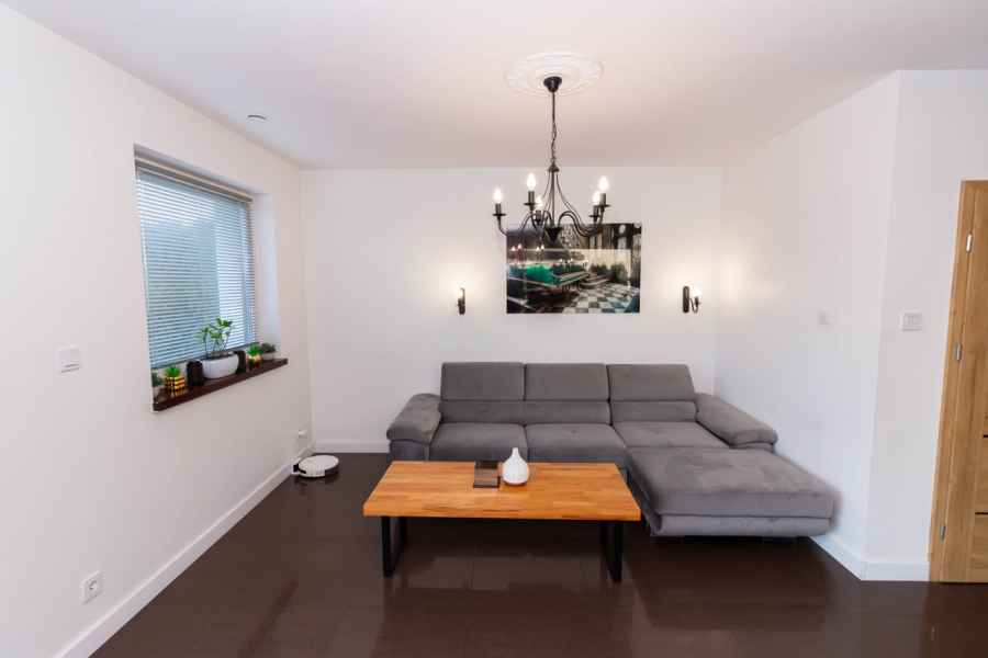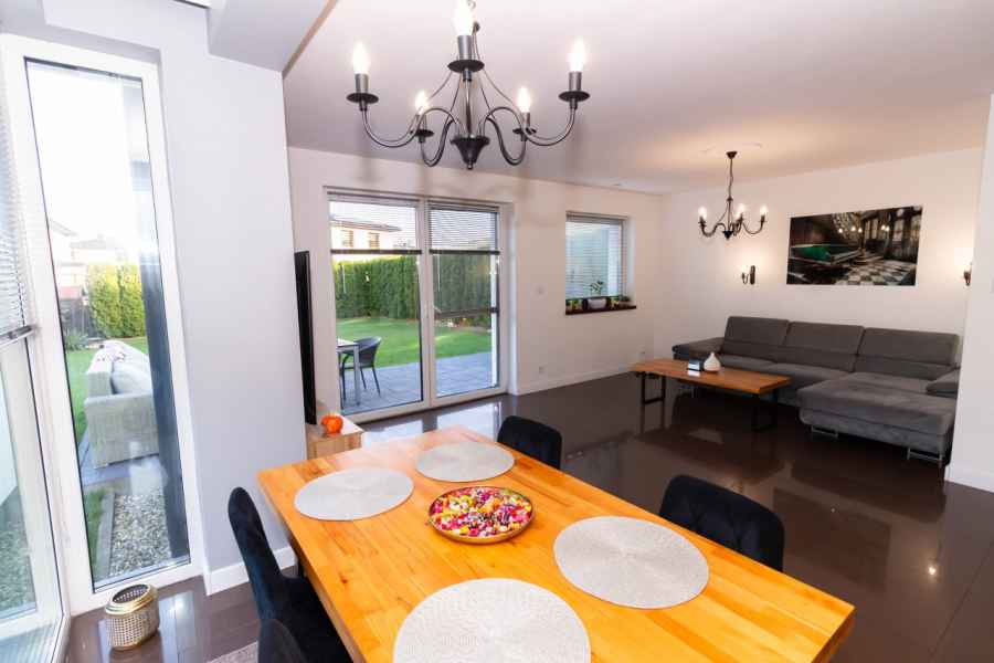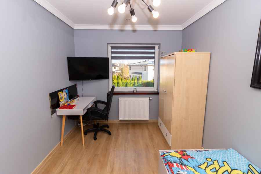 Zarówno mury, jak i konstrukcja dachu są w stanie idealnym. Dom jest ocieplony styropianem i wykończony elewacją. Dom wyposażony jest w wydajną instalację fotowoltaiczną oraz rekuperację co mocno wpływa na niskie koszty energii elektrycznej i gazu. Drzwi wejściowe oraz drzwi prowadzące do garażu - przeciwwłamaniowe. Zamontowano trzyszybowe okna PVC, zapewniające bardzo dobrą izolację termiczną. Ogrzewanie z dwufunkcyjnego pieca gazowego. W części parterowej domu zamontowane zostało ogrzewanie podłogowe na całej powierzchni. Ściany pokryte gładzią. Podłogi wyłożone terakotą i dobrej jakości panelami. Łazienki wykończone glazurą i terakotą. Dach pokryty jest dobrej jakości blachą. Na zewnątrz została zamontowana kamera monitoringowa z czujnikiem ruchu i systemem powiadamiania w przypadku zarejestrowania ruchu. Wszystkie instalacje sprawne. Na tyłach domu mieści się strefa zielona z zadbanym, regularnie pielęgnowanym trawnikiem, nasadzeniami wokół ogrodzenia dającymi intymność oraz tarasem. Na wyposażeniu domu jest automatyczny robot koszący oraz instalacja nawadniająca trawnik - sterowane z poziomu telefonu. Miejsce idealne do wypoczynku czy spotkań rodzinnych.