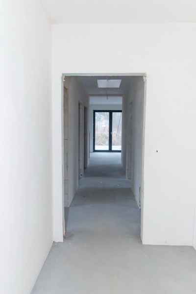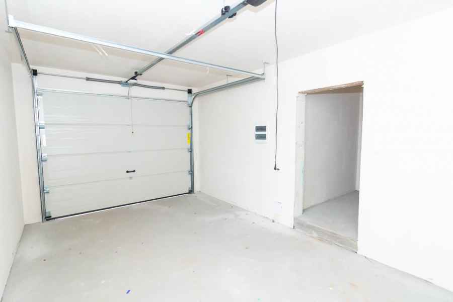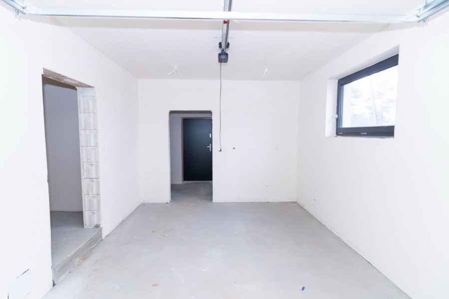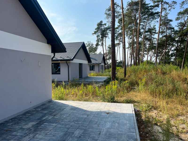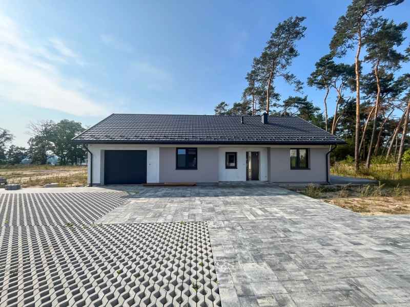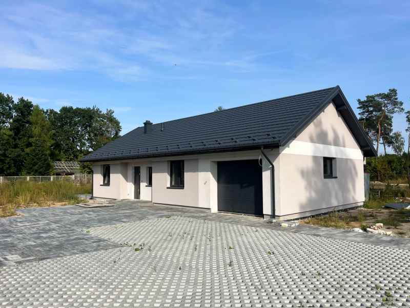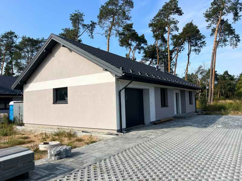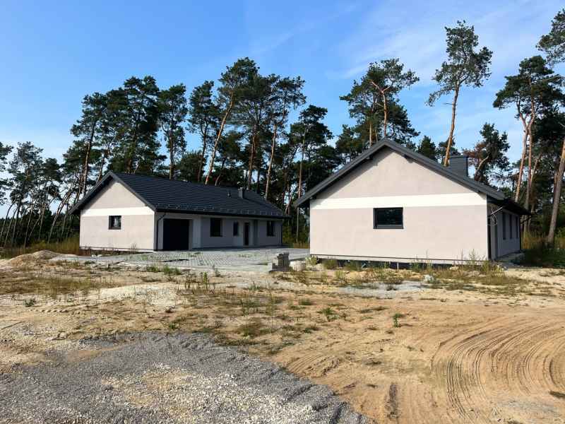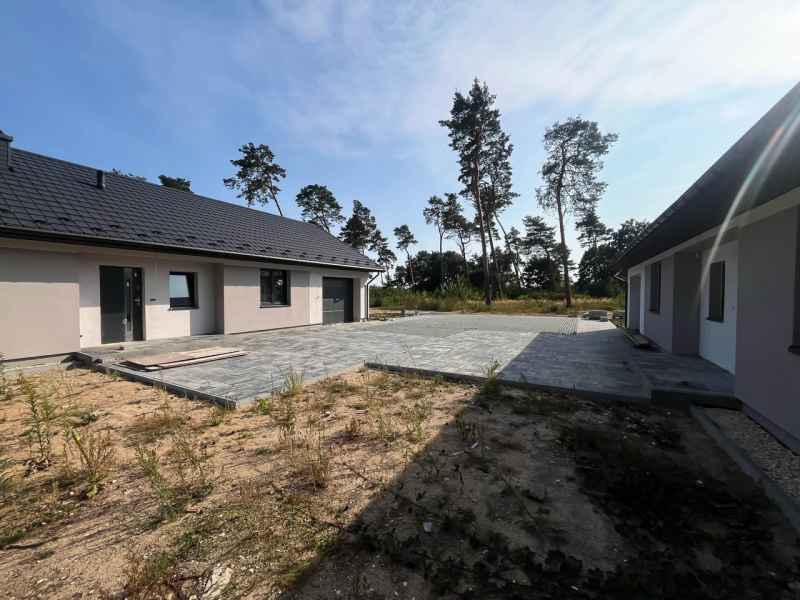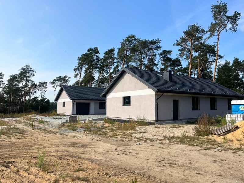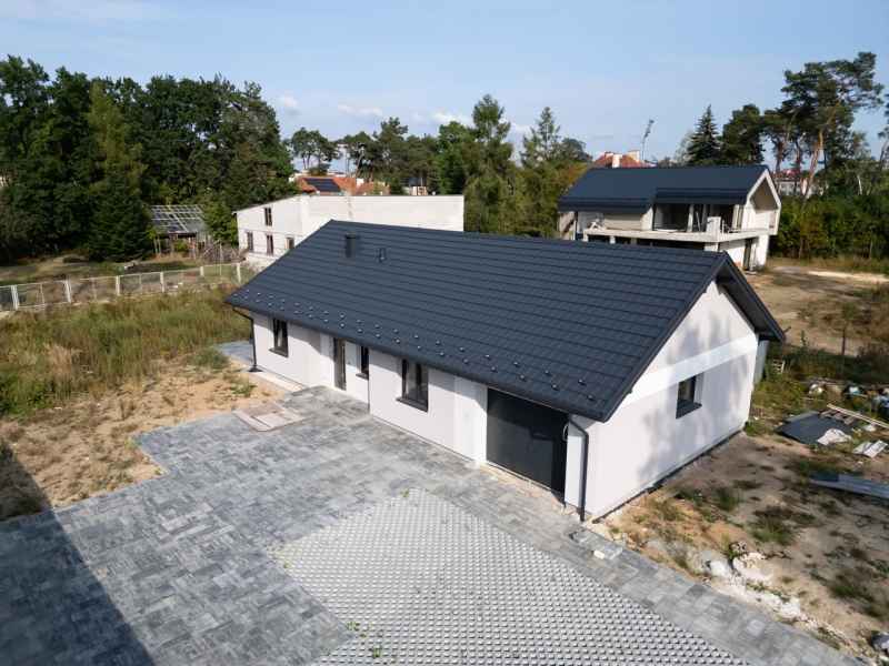 Na całości domów zostało zamontowane ogrzewanie podłogowe, a poddasze docieplone jest styropianem o grubości 30 cm z wykonaną wylewką. Budynek jest bardzo ekonomiczny pod względem ogrzewania. Na ścianach wykonano tynki gipsowe. Instalacja wodno-kanalizacyjna oraz instalacja elektryczna są w pełni rozprowadzone i podłączone. Na posesji znajduje się również zbiornik na wodę o pojemności 10 000 litrów przeznaczony do systemu nawodnienia. Dach pokryty jest blachodachówką w kolorze grafitu wraz z kompletnym orynnowaniem. Stolarka okienna i drzwiowa zewnętrzna wykonana jest w kolorze antracytowym, a garaż wyposażony został w automatyczną bramę na pilota firmy Wiśniowski. Budynek jest ocieplony i wykończony tynkiem w kolorze białym oraz jasnoszarym. Do nieruchomości przynależy duży taras o powierzchni 30 m² wykonany z płyt betonowych, a także opaska wokół budynku i podjazd z kostki brukowej.