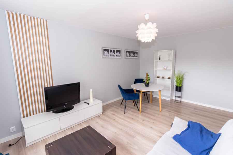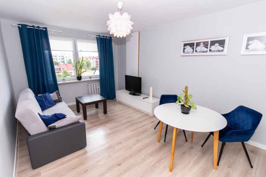 - Przestronny salon. Pokój wyposażony w komfortową kanapę, stół, fotele oraz telewizor,